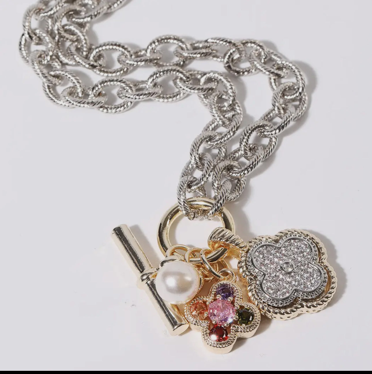 The rope-textured chain offers a timeless appeal, while the gold-accented floral charm, pearl drop, and colorful clover charm add playful elegance. A toggle bar detail enhances the design with a modern twist. Whether you're dressing up for an event or adding a chic touch to your everyday look, this necklace is versatile enough to complement any style. With its secure clasp and thoughtful detailing, it's a perfect gift or personal statement piece for lovers of unique, feminine jewelry