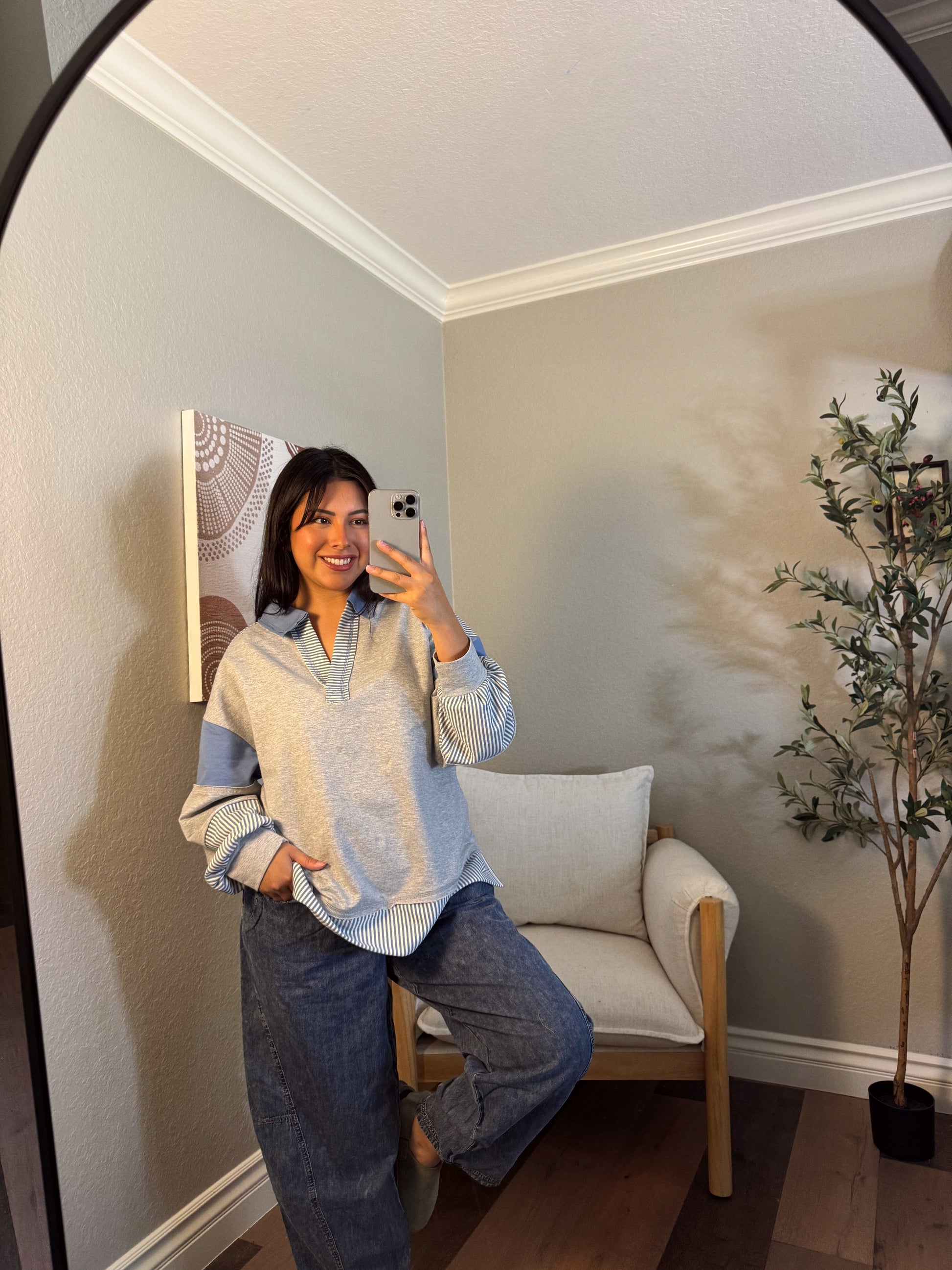 Add a pop of color to your wardrobe with our Feeling Blue Color Block Top! This casual and oversized top features a unique color block design with solid and striped panels. The drop shoulder and collared neckline add a stylish touch, while the long sleeves keep you warm. Perfect for any occasion, this top is sure to make you stand out in the crowd with its playful and quirky design.