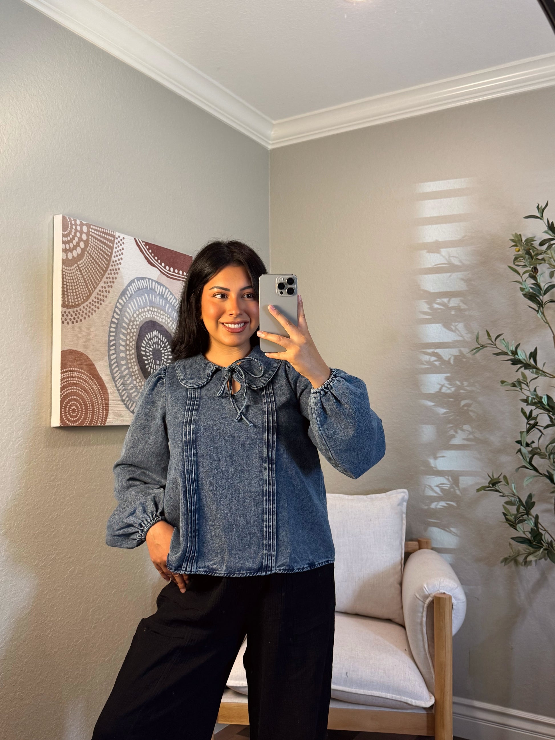 Experience the luxurious look and feel of the Josie Denim Blouse, featuring a stunning mineral wash, long sleeves, and a front tie with intricate pintuck details. Elevate your wardrobe with this must-have piece!