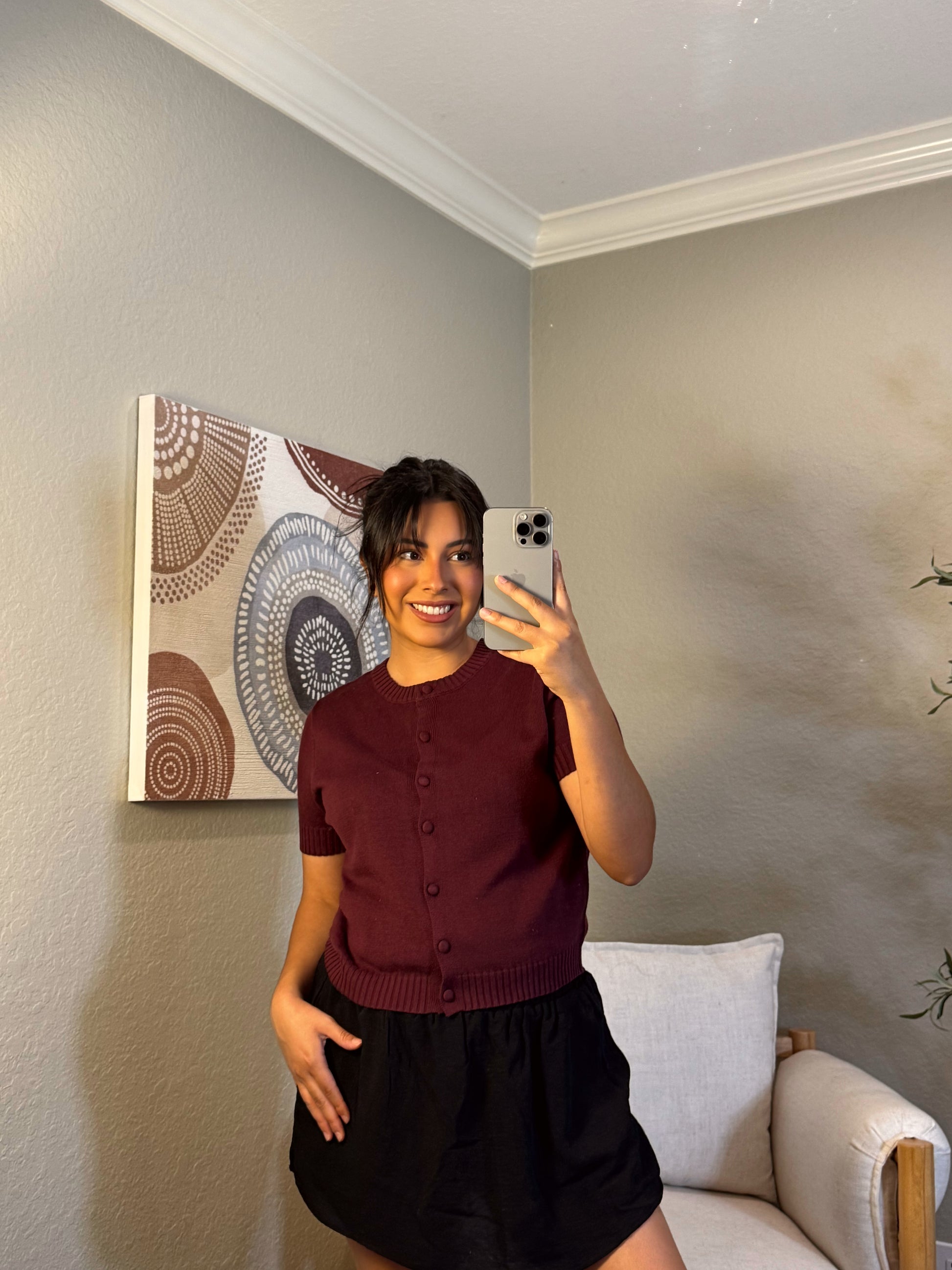 This cardigan is your new everyday essential! With a snug silhouette, crew neckline, and short sleeves, it'll be your go-to for any occasion. A perfect addition to any outfit (and a perfect excuse to skip the gym)!