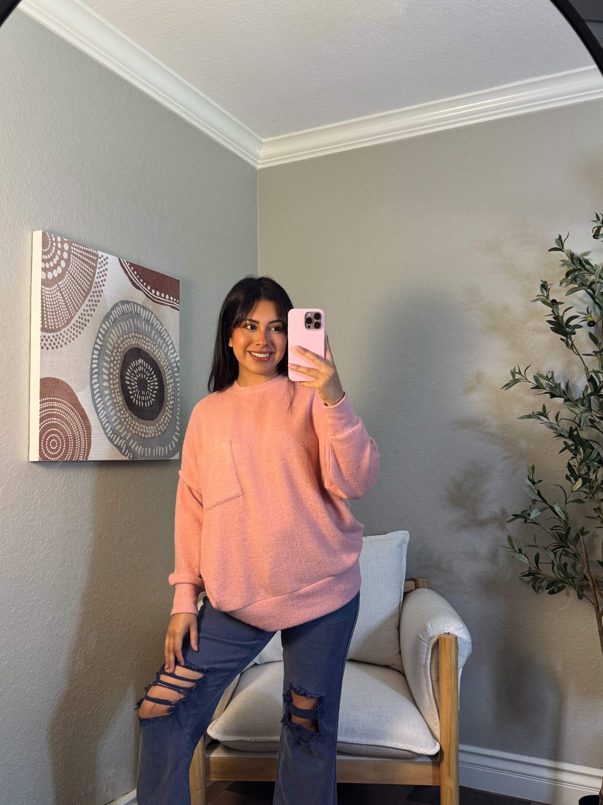 Indulge in sweetness with our Strawberry Shortcake Melange Sweater. This oversized fit swearer features seam accents, a chest pocket, and a hi low hem for a unique touch. Stay cute and comfortable in this playful piece.